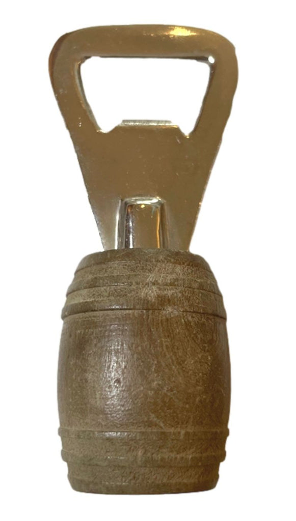 This wooden barrel-shaped bottle opener brings rustic charm and function together. Crafted to resemble a classic oak barrel, it features a smooth wood finish with a sturdy metal opener. Perfect for adding vintage character to any home bar.